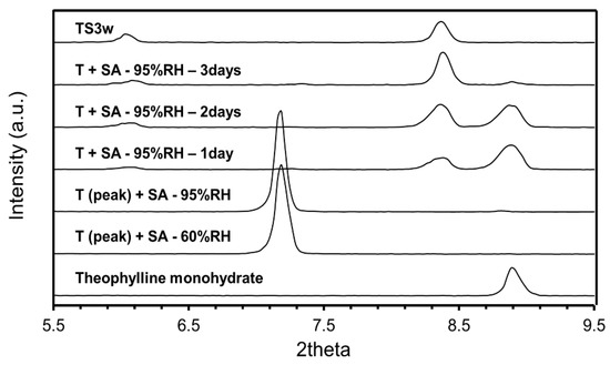 A VH-XRPD (Variable Humidity—X-ray powder diffraction) experiment was also carried out. Theophylline and Squaric Acid (molar ratio 1:1) powders were mixed and exposed to 95% RH for 3 days (Figure 4).
