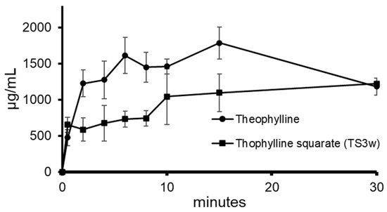 Those studies demonstrated a better dissolution profile of the salt compared with the free base (Figure 6) leading to a decrease of 52% at 2 min, 54% at 6 min, and 38% at 15 min for TS3w. This valuable reduction might turn into an improved in-vivo performance allowing a better control of the administrated drug in terms of both therapeutic effects and adverse reactions. This is very useful in many cases, and it might even be essential when the therapeutic index is very narrow like in this case for Theophylline.