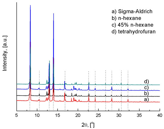 As mentioned in the introduction part, L-lactide dissolves very well in many solvents, which could be an issue for crystallization process design. In this part, solubility screening was carried out to examine the anti-solvent effects of n-hexane on L-lactide/THF systems. Relating to the possibility of polymorphism and/or solvate formation, the residual solids harvested from these solubility measurements were compared to the reference sample (purchased from Sigma-Aldrich). Figure 2 shows that the XRD patterns of the reference and the recrystallized L-lactide species (for all samples in pure n-hexane and tetrahydrofuran as well as the mixed solvent) crystallize with the same structure. Identical 2θ positions of these samples were found at 8.3, 12.8, 13.9, 16.7, 22.6, and 28.2°, etc. Thus, the effects of different polymorphs or solvates are not involved in the solubility determination of L-lactide under the studied conditions.