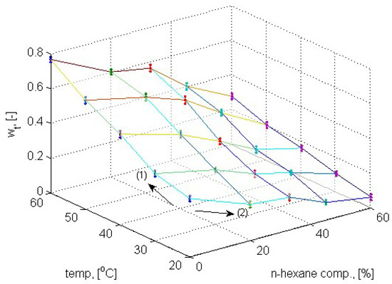 Figure 3 presents solid–liquid equilibria (SLE) of L-lactide in various mixtures of n-hexane and tetrahydrofuran. Herein, two trends are guided for the eye by arrows (1) and (2), which indicate the influence of temperature and anti-solvent content (mHex./mmixed_solvent) on the solubility, respectively.