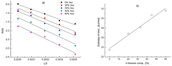 The Van ’t Hoff approach was applied for each of the solvent compositions using Equation (13) [30]. Enthalpies of dissolution were calculated from slopes of linear regressions of which logarithm of mole fraction ln(x) versus reciprocal of absolute temperature (1/T) was plotted, where R is the universal gas constant.