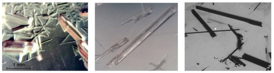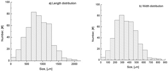 Actually, kb and kg in Equations (5) and (6) are temperature-dependent parameters. In this work, the crystallization processes were performed under isothermal conditions; thus, these parameters were treated as constants. Hereby, the volumetric shape factor kv was introduced. Indeed, kv is an appropriate shape factor that describes the geometric shape of the crystals. In fact, the empirical parameter kv was also herein assumed to remain unchanged and was calculated from Equation (7). To obtain this equation, the needle-shaped crystals were approximated to “two-dimensional cylinders” (Lwidth × Llength) [10,26], as demonstrated in Figure 1.