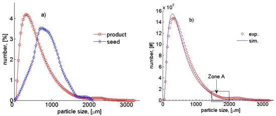 Comparing the CSDs in Figure 7b, a good agreement between the experimental data (open dots) and modeling results (continuous line) of the final product is observed for the size ranges below 1500 µm and above 2000 µm. Obviously, the CSD from the simulation indicates that the product involves crystals from the growth phase and newly formed crystals. This trend shares similarity to the experimental CSD; therefore, the model is relatively well identified. However, a discrepancy between the two approaches is noticeable, as indicated in zone A (Figure 7b). That could be related to insufficient descriptions of the implemented model, which results in two separate populations in the simulated CSD. To improve the numerical solution, the modified PBE model is recommended, which should consider the effects of attrition, crystal breakage, and aggregation, etc. [4,7,8]. Theoretically, these events can create an intermediate population, which compensates for the absence of medium-sized crystals (zone A). Another reason could be originated from insufficient experimental information, which also leads to the above difference.