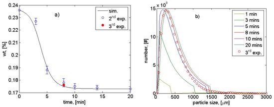The second experiment under the same conditions to the previous one was carried out, and the variation of the solute concentration of the mother liquor during this crystallization is shown in Figure 8a (open dots). At first, in the early period up to about 8 min after seeding, there is a strong drop in the solute concentration, which is clearly showing up as desupersaturation relating to the secondary nucleation and crystal growth. After this period, the concentration continuously decreases but not so drastically because of the loss of the driving forces relating to the consumption of supersaturation in the previous time. From 10 min to the end, the concentration is almost unchanged, and the system appears to reach equilibrium. Afterwards, the experimental variation of the solute concentration was compared with that of the simulation (continuous line, Figure 8a). The trajectory of the mother liquor, which was derived from the mass balance (Equation (8)), fits well to the experimental desupersaturation tendency. To quantify the crystallization process, on the one hand, the solid product was harvested after 20 min and dried for 8 h. Consequently, an amount of 28.5 g dried solid was obtained. Thus, at the end of the process, the experimental yield was determined at a value of 30.2%. On the other hand, the theoretical yield was also predicted at a value of 32.3%, which was comparable to that of the experiment. The small difference can be explained due to the mass loss during the product collecting and drying steps. Hence, the simplified 1D-PBE model described relatively well the crystallization of the investigated system.