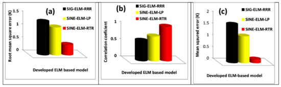 The future prediction and generalization strength of the developed ELM-based models were compared using performance metrics such as the mean squared error (MSE), correlation coefficient (CC) and root mean square error (RMSE). Figure 2 presents the comparison using a testing set of data. The comparison presented in Figure 2a on the basis of RMSE shows that the developed SINE-ELM-RTR model outperformed the SIG-ELM-RRR and SINE-ELM-LP models with a performance improvement of 68.78% and 62.60%, respectively, while the developed SINE-ELM-LP model performed better than the SIG-ELM-RRR model with an improvement of 16.51%.