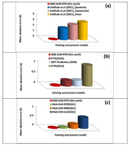 The developed SINE-ELM-RTR model outperformed Intikhab et al.’s 2021 linear model [53], Intikhab et al.’s 2021 exponential model [53] and Intikhab et al.’s 2021 quadratic model [53], with a performance improvement of 99.06%, 98.89% and 98.57%, respectively, using MAE as a performance metric, as presented in Figure 4a. A performance superiority of 57.61%, 87.89% and 95.11% was respectively obtained, as presented in Figure 4b, while comparing the performance of the developed SINE-ELM-RTR model with the existing HGA-SVR-RTR (2021) [54], HGA-SVR-RRR (2021) [54] and HGA-SVR-CLD (2021) [54] models using the same performance evaluation parameter. The developed SINE-ELM-RTR model further outperformed the existing GRP-prediction (2020) [55] model, STTE (2016) model [56] and STTE (2014) [6] model with a performance enhancement of 89.34%, 89.30% and 97.02%, respectively, as shown in Figure 4c.
