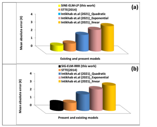 Comparison between the performance of developed SINE-ELM-LP and SIG-ELM-RRR models and the existing models on the basis of mean absolute error (a) comparison of the developed SINE-ELM-LP model with STTE(2014) [6], Intikhab et al. (2021)_Quadratic [53], Intikhab et al. (2021)_Exponential [53] and Intikhab et al. (2021)_linear [53] (b) comparison of the developed SIG-ELM-RRR model with STTE(2014) [6], Intikhab et al. (2021)_Quadratic [53], Intikhab et al. (2021)_Exponential [53] and Intikhab et al. (2021)_linear [53].