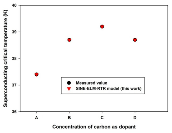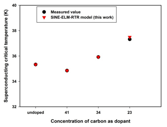 The superconducting-critical-temperature-enhancement tendency of carbon was investigated using the developed SINE-ELM-RTR model through carbon-encapsulated amorphous boron. The comparison of the results of the developed SINE-ELM-RTR model with measured values [10] is presented in Figure 6. The observed enhancement of superconducting properties due to the carbon incorporation in the lattice structure of MgB2 superconductor can be attributed to the homogenous distribution of carbon particles in the doped sample as a result of the implemented encapsulation. This leads to the grain of reacted MgB2 being restricted from unnecessary growth [10]. The observed increase in resistivity due to impurity scattering in the lattice of MgB2 served as the descriptor for the developed model.