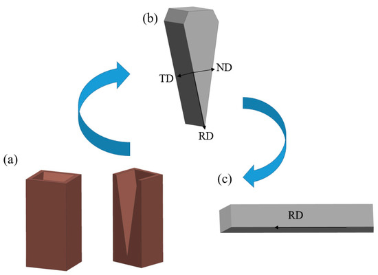 The rolling direction (RD), the transverse direction (TD) and normal direction (ND) were shown in Figure 1. The samples for microstructure observation were taken from the states along the TD and ND. The grain structure of metallographic specimens was etched by the Sulfuric Phosphoric acid solution (H2SO4: H3PO4: H2O = 38: 43: 19) and were observed by a LeitzMM-6 OM. The XRD analysis was undertaken on a Pw3040/60 X-ray diffractometer (PANalytical B.V., The Netherlands) at 40 kV with Cu–Kα radiation (wavelength λ = 0.15406 nm) measuring the lattice constant and the dislocation density. The length step, the scanning speed, and the diffraction angle (2θ) range of XRD were 0.02°, 1°/min and 10–90°, respectively. The EBSD tests were performed over the rolling direction of the specimens by Zeiss crossbeam 550 microscopies with a step length of 0.223 μm. The acquired result was analyzed with the orientation imaging microscopy software HKL-Channel 5 and the measured pole figures {111}. The specimens for EBSD analyses were first ground by SiC paper to #5000 and then Argon ion polishing was applied to eliminate residual stress. Specimens were cut from different positions of 1561 aluminum alloy plates designed with a deformation gradient for the hardness and conductivity test. The hardness was measured with a contact load of 200 gf to assess the softening degree of deformation. The electrical conductivity was measured using a Sigmascope EX 8 instrument at room temperature (25 °C) to examine the precipitation behavior. The average hardness and EC were obtained through five measurements completed in the RD for the different deformation samples.