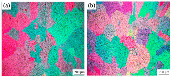 The as-cast metallographic structure of 1561 aluminum alloys is shown in Figure 2. It is observed that the grains on the surface of the 1561 aluminum alloy are approximately equiaxed, and the size distribution is uneven. The as-cast structure has a typical dendritic morphology, because the surface of the ingot has a fast-cooling rate, and there is not enough time and space for the grains to grow after nucleation; the preferential growth of the nucleated grains is caused by uneven distribution of surface temperature.