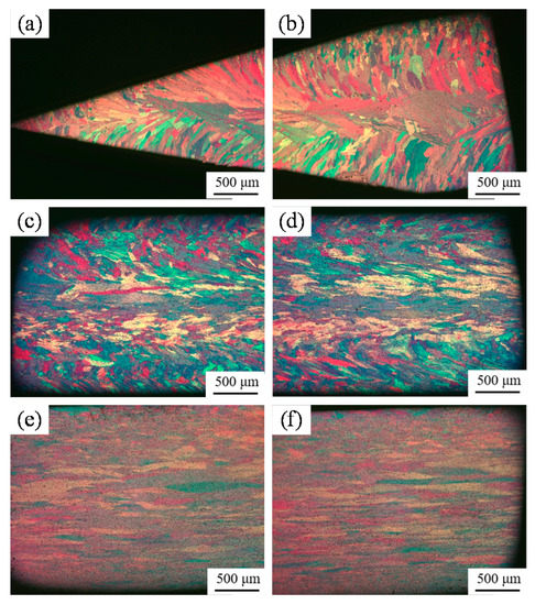 Further observation shows that compared with the microstructure before rolling (Figure 2), the sample is deformed by rolling, the grains are irregular in shape and size along the rolling direction, and the grains were elongated (Figure 3a–d). With the increase in rolling deformation, the grains are elongated more significantly. It can be found from Figure 3e–f that the grains of the H2 plate have a more delicate and slender fibrous structure than the H1 plate in Figure 3c–d with the increment of deformations. However, there is still a sizeable dendritic structure where there is no deformation at the tip of the rolled state in Figure 3a,b.