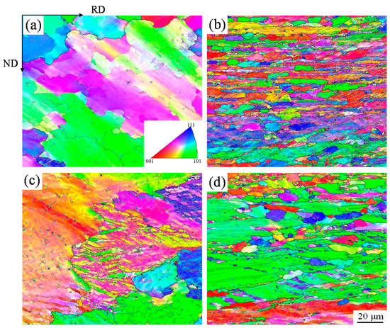 EBSD IPF maps of annealed 1561 aluminum alloys at different deformation stages in the central region. (a) the H1 plate; (b) the H2 plate; (c) the N1 plate; (d) the N2 plate.