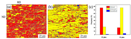 Recrystallized, substructured and deformed microstructures of the 1561 aluminum alloy with different states. (a) the H2 plate (b) the N2 plate (c) Statistical distribution histogram.