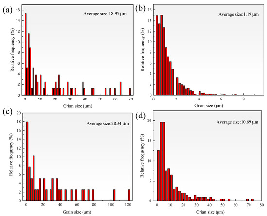 Relative frequency of grains size of annealed 1561 aluminum alloys. (a) the H1 plate; (b) the H2 plate; (c) the N1 plate; (d) the N2 plate.