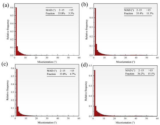 Misorientation angle distribution (MAD) histogram of 1561 aluminum hot rolled plate. (a) the H1 plate; (b) the H2 plate; (c) the N1 plate; (d) the N2 plate.
