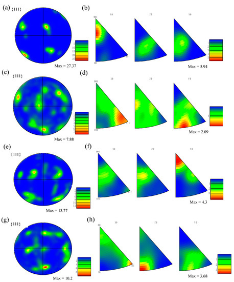 Pole figure IPF maps of annealed 1561 aluminum alloys at different deformation stages. (a,b) the H1 plate; (c,d) the H2 plate; (e,f) the N1 plate; (g,h) the N2 plate.