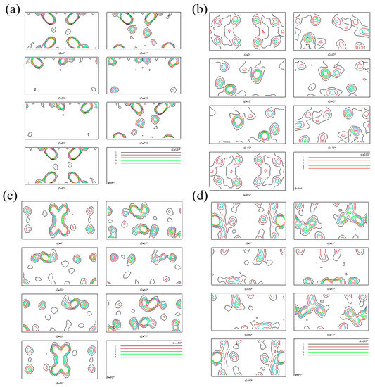 ODF sections of annealed 1561 aluminum alloys: (a) the H1 plate;(b) the H2 plate; (c) the N1 plate; (d) the N2 plate.