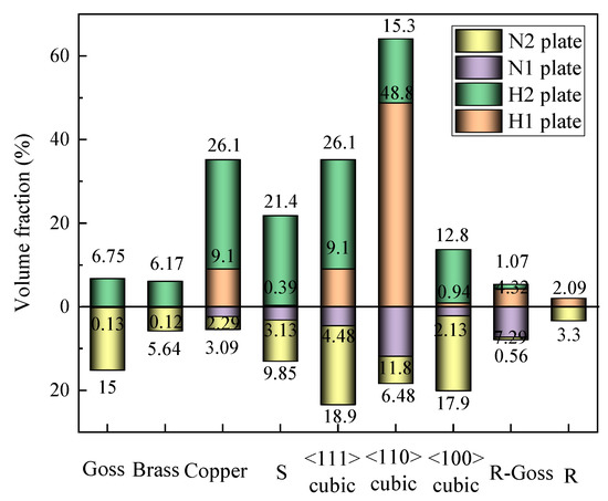 Figure 10 shows the volume fraction of the main texture components of annealed 1561 aluminum alloys. It is illustrated that the most prevalent textures are different in the four plates: the most prevalent textures in the H1 plate are <110> Cubic, <111> Cubic, R-Goss, Copper textures, accounting for 48.8 vol.%, 9.1 vol.%, 4.32 vol.% and 9.1 vol.%, respectively, with the increasing deformation of 1561 aluminum alloys, the Goss and Brass deformation textures appeared and the copper and S textures increased, after annealed, the most prevalent textures in the N1 plate are <110> Cubic and (110) <110> R-Goss textures, accounting for 11.8 vol.% and 7.23 vol.%, respectively, the most prevalent textures in the N2 plate are <111> Cubic, <100> Cubic, (110) <100> Goss, (110) <112> Brass, (123) <634> S textures, accounting for 18.9 vol.%, 17.9 vol.%, 15 vol.%, 5.64 vol.% and 9.85 vol.%, respectively, the accumulated deformation results in the difference as mentioned above in the 1 and 2 plate. Moreover, the fraction of fiber component is higher than that of other components in all plates. A fairly high amount of (110) <100> Goss texture (15%) indicates the presence of the α-fiber running from Brass to Goss orientation. As a result, the central part of the plate has undergone a gradient deformation following the normal plane strain mode typical of the FCC crystal [33,34]. It was reported that the Brass texture component is stable during rolling but becomes unstable due to other deformation [35]. Thus, in this study, the variation of the fraction of Cubic, S, Brass and the Goss texture components reflect that the increased deformation. Gradient hot rolling further provides shear strain, resulting in different proportions of deformation textures (brass and R-Goss) in the rolled plate. The gradient hot rolling increases the fiber texture orientation grains due to plane strain.