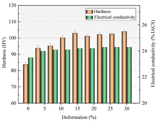 Hardness and electrical conductivity change with different deformation of the plate after annealed.