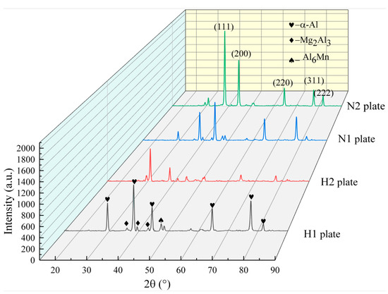 Figure 12 show the XRD patterns of 1561 aluminum alloy at different states. It can be found that regardless of whether it is annealed or not, the prominent diffraction peaks observed in the sample are α-Al diffraction peaks and some weaker diffraction peaks such as Al6Mn and Mg2Al3. As the experimental materials have undergone severe rolling deformation at a high temperature, the diffraction peaks of phases obtained via the test will more or less shift at a slight angle. It is necessary to rely on other testing equipment and the related literature to determine the type of phases. It can be observed that the peak heights of α-Al obviously change in a different state of the plate, which was manifested in that the peak heights of α-Al decrease gradually by increasing the deformation. At the same time, comparing the two states, it is found that the corresponding diffraction peak intensity of the H2 plate is low, and the width is large, which indicates that after hot rolling, the grains of the alloy were refined, and the lattice distortion increased. For the N2 plate, the full width at half maximum of the α-Al peak becomes smaller, indicating that the crystal grains have grown to a certain extent after annealed. This result is consistent with the result in Figure 6.