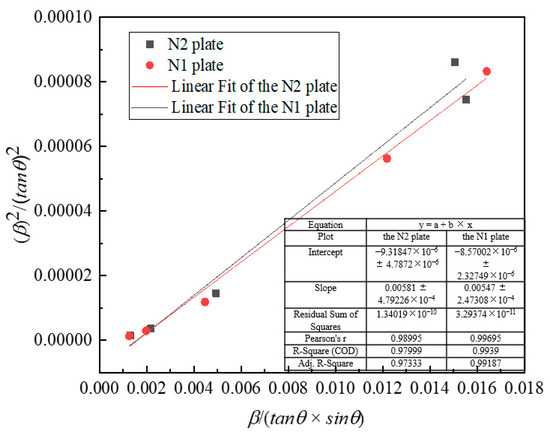 According to the slope and intercept of the fitted straight line in Figure 13, the slope of the fitted straight line and the size of the crystallites, the ordinate intercept and the microscopic strain have the following relationships, the crystallite size and microscopic strain can be further calculated by Equation (2).