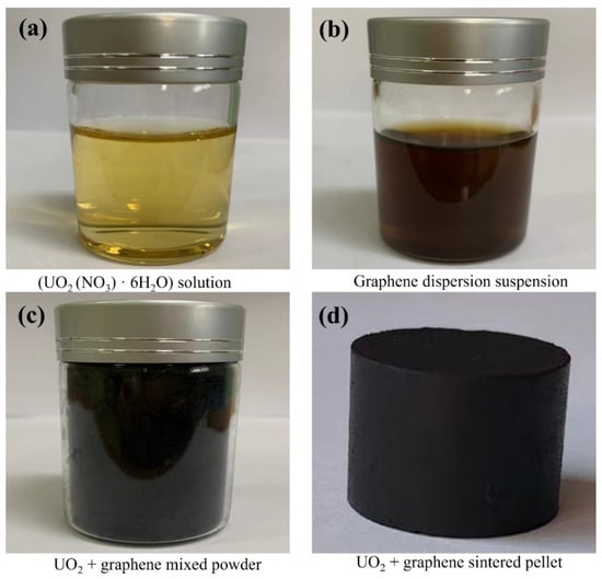Experimental steps (a) (UO2(NO3)·6H2O) solution, (b) Graphene dispersion suspension, (c) UO2 + graphene mixed powder, and (d) UO2 + graphene sintered pellet for the preparation of UO2–graphene composite powder by in situ synthesis.
