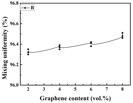 Table 1 and Figure 2 show the mixing uniformity of powders with different graphene levels. The mixing uniformity of powders prepared by physical mixing was less than 92%. When the graphene content was low (2%), it was more difficult to mix the powder evenly, since the density difference between graphene and UO2 was too large and the physical mixing tended to agglomerate the graphene. For powders prepared by in situ synthesis, the mixing uniformity was not only high (>96% for all), but also not as dependent on the content of graphene. The reason for this was that the graphene synthesized in situ had been completely coated by the UO2 powder, which resulted in the formation of composite particles. These particles were similar to matrix UO2 in density, and their surfaces were homogenous. Therefore, they mixed evenly.