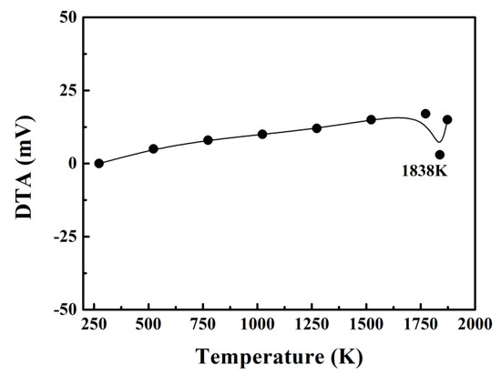 Figure 3 shows the DTA curve of UO2–graphene reaction kinetics. Below 1773 K, there was no obvious reaction between UO2 and graphene. UO2 reacted with graphene at 1838 K and exothermic peaks appeared in the curve. Figure 4 shows a phase structure comparison for sintered pellets. At 1723 K, the sintered pellets had two phases, that is, UO2 and graphene phases. UO2 did not react with graphene and graphene dispersed in the UO2 matrix intact, and the second phase was protected [16]. The XRD phase pattern was consistent with the DTA analysis results.