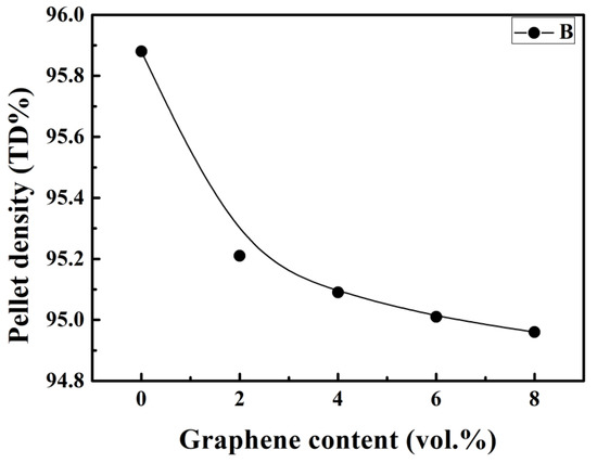 The density of UO2–graphene sintered pellets was measured by drainage, as shown in Table 2 and Figure 5. With higher graphene content, the density of sintered pellets prepared by physical mixing and in situ synthesis both decreased. This was because the sintering densification of UO2 was mainly achieved by atomic diffusion, and the doping of graphene prevented UO2 from diffusing between atoms, which could have decreased the density of the sintered pellets [17,18].
