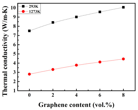 For the thermal conductivities of UO2–graphene sintered pellets, see Table 3 and Figure 6 and Figure 7. The thermal conductivities of sintered pellets prepared by either physical mixing or in situ synthesis increased gradually with graphene, and the graphene improved the heat transfer capacity of the pellets. For sintered pellets with the same graphene content, the thermal conductivity of pellets prepared by in situ synthesis was relatively high for three reasons: first, for pellets prepared by in situ synthesis, graphene dispersed fully with a good mixing uniformity (as shown in Table 1). The pellets with high graphene mixing uniformity were more likely to form a network bridge in the pellets, which was conducive to the outward transfer of pellet heat. Second, the UO2–graphene interfacial binding properties for the pellets prepared by in situ synthesis were better than physical mixing; for the mixed powder prepared by a wet process, a contact at the molecular level may be achieved, which is conducive to interfacial bonding during sintering. Third, the sintering density for pellets prepared by in situ synthesis exceeded that of physical mixing (as shown in Table 2), and the sintering density directly influenced the thermal conductivity of pellets. Therefore, the thermal conductivity of pellets prepared by in situ synthesis was relatively high. At room temperature, the thermal conductivities of sintered pellets doped with 2%, 4%, 6%, and 8% graphene prepared by in situ synthesis increased by 12.27%, 20.13%, 27.47, and 34.13% respectively.