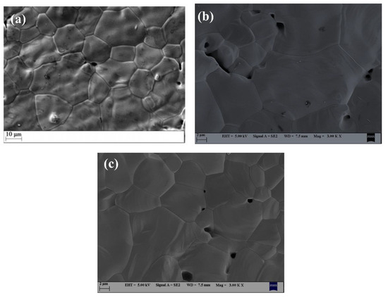 Figure 8 shows the microstructures of UO2–graphene sintered pellets (graphene contents 8% and 4%) prepared by physical mixing and in situ synthesis. The pellets prepared by physical mixing showed more pores concentrated along the grain boundary due to lack of physically mixed pellets, as the UO2 did not mix with the graphene powder evenly, which resulted in agglomeration. The agglomerated graphene concentrated at the grain boundary of UO2 hindered the sintering densification of UO2 pellets, which produced more pores, while pellets prepared by in situ synthesis did not show obvious pores at the grain boundary because the grains were closely bonded. This was due to graphene coating UO2 during the preparation of the mixed powder, which bound at the molecular level. Such a mixed powder has two advantages: first, UO2 evenly mixes with graphene without the agglomeration of graphene. Second, during sintering, homogenous substances between UO2 particles bound directly and increased the sintering density. Graphene was uniformly coated by UO2, and the thermal conductivity of the pellets improved by forming a bridging heat conduction network [19,20].