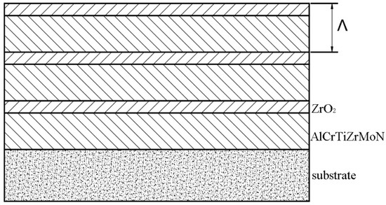 With the rapid development of technology in the industry, the working environment of tools has become harsher, and the protective coating needs to have more comprehensive properties, such as hardness, wear resistance, thermal stability, and corrosion resistance. Traditional monolayered binary or ternary coatings are difficult to meet the requirements when they are required to work in harsh working conditions. Koehler [] proposed the concept of a nano-multilayered film in 1970. Nano-multilayered films are formed by alternately depositing two materials with nanoscale thickness. The thickness of two different layers is called the modulation period. In 1977, Yang et al. [] fabricated Au-Ni and Cu-Pd nano-multilayered films, and their hardness and elastic modulus both unusually improved. Chu et al. [] prepared a TiN/Ni nano-multilayered film and found that the hardness of the film increased to 3500 kgf mm−2 when the modulation period was 2.2 nm.
