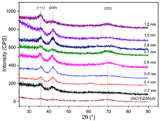 In Figure 2, the values of the ZrO2 thicknesses are marked on their corresponding XRD patterns. The monolithic (AlCrTiZrMo)N film and the (AlCrTiZrMo)N/ZrO2 nano-multilayered films present an fcc structure. The diffraction peaks of the monolithic (AlCrTiZrMo)N film are weak. As the thickness of the ZrO2 layer increases, the (111) and (200) peaks of the (AlCrTiZrMo)N/ZrO2 nano-multilayered films first become large and then small. When the ZrO2 layer thickness is 0.6 nm, the peak intensity reaches the maximum value. According to the previous reports of nano-multilayered films [], it can be inferred that when the ZrO2 layer thickness is less than 0.6 nm, the ZrO2 layer changes from a monoclinic structure to an fcc metastable structure under the template effect of the (AlCrTiZrMo)N layer, and it forms co-epitaxial growth with the (AlCrTiZrMo)N layers. Therefore, the crystallinity is improved, and, correspondingly, the intensity of the diffraction peak becomes strong. However, when the ZrO2 layer thickness is more than 0.6 nm, the effect of the improved crystallinity of the nano-multilayered film gradually disappears. Therefore, the crystallinity becomes generally weak, and the intensity of the diffraction peak tends to decrease. It can also be seen in Figure 2 that the (AlCrTiZrMo)N/ZrO2 nano-multilayered film shows a shift toward a lower angle in the (111) diffraction peak when the ZrO2 layer thickness is 0.6 nm.