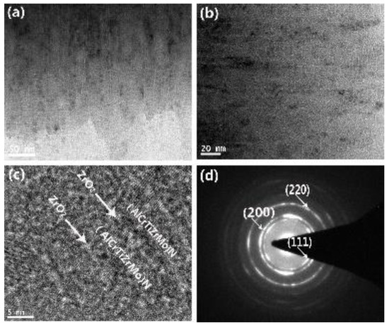 Figure 3 presents the HRTEM images of the cross-sectional morphology of the (AlCrTiZrMo)N/ZrO2 nano-multilayered film with the ZrO2 layer thickness of 0.6 nm. In the low-magnified image of Figure 3a, the (AlCrTiZrMo)N/ZrO2 nano-multilayered film has a good columnar structure along the direction of the film growth. The width of the columnar crystal is about 20–50 nm, the length runs through several modulation periods of the nano-multilayered film, and the insertion of the ZrO2 layer does not damage the columnar crystal growth. Figure 3b presents the medium-magnified cross-sectional morphology, which indicates a well-grown nano-multilayered film structure. The layers with the gray contrast are (AlCrTiZrMo)N, and the ones with the bright contrast refer to ZrO2. The (AlCrTiZrMo)N and the ZrO2 layers are alternately deposited to form a continuous nano-multilayered film structure. Figure 3c presents a high-magnified HRTEM image from the selected area of Figure 3b. The modulation period of the nano-multilayered film is measured as 8 nm, and the nanocrystal distribution is very dense and uniform. Chu et al. [] calculated the hardness behavior of multilayered film, and the hardness was significantly improved when Λ = 5~10 nm. The lattice fringes can continuously move across several modulation periods, indicating that the ZrO2 layer transforms into an fcc structure under the “template effect” of the (AlCrTiZrMo)N layers and grows epitaxially with them. The (111), (200), and (220) fcc-structured diffraction rings are presented in the selected area electron diffraction (SAED) patterns of Figure 3d, which are consistent with the results in the XRD patterns.