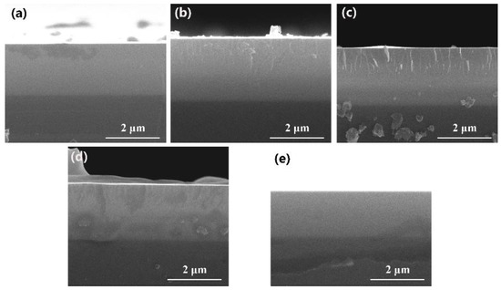 Cross-sectional SEM images of nano-multilayered films with different ZrO2 thicknesses: (a) 0.2 nm, (b) 0.4 nm, (c) 0.6 nm, (d) 0.8 nm, and (e) 1.2 nm.