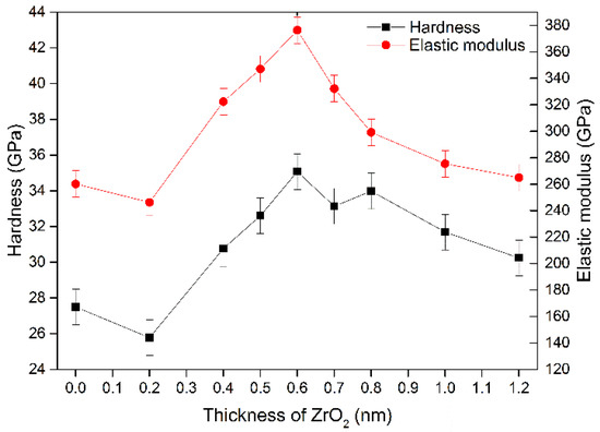 - When the film thickness of ZrO2 increases, the mechanical properties of the nano-multilayered film first increase and then decrease. When the ZrO2 film thickness is 0.6 nm, the maximum values of the hardness and elastic modulus are obtained, which are 35.1 GPa and 376.4 GPa, respectively. The strengthening effect can be attributed to the modulus difference between ZrO2 and (AlCrTiZrMo)N and the alternating stress field theory. The actual hardness is slightly lower than the theoretical hardness, which may be due to the structural transformation of the ZrO2 layers under the coherent structure in the film, resulting in a change in the modulus.