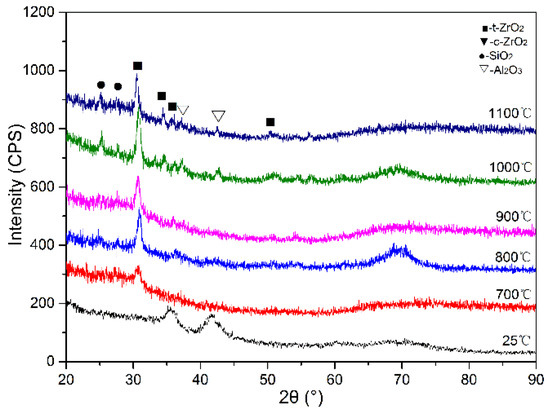 To evaluate the thermal stability of the (AlCrTiZrMo)N/ZrO2 nano-multilayered film, the (AlCrTiZrMo)N/ZrO2 nano-multilayered film with the ZrO2 layer thickness of 0.6 nm was annealed in air at 700 °C, 800 °C, 900 °C, 1000 °C, and 1100 °C for 30 min. The XRD patterns of the annealed films can be seen in Figure 6. It can be observed that as the temperature increases, the number of XRD peaks of the oxides of the (AlCrTiZrMo)N/ZrO2 nano-multilayered film increases, suggesting that the degree of oxidation rises with an increase in the annealed temperature. After annealing in the temperature range from 700 °C to 900 °C, based on the XRD patterns, only the ZrO2 can be found in the annealed film, indicating that the nano-multilayered film is slightly oxidized, and the basic composition of the nano-multilayered film is not changed. After annealing at 1000 °C and 1100 °C, more oxides, such as SiO2 and Al2O3, are found in the XRD patterns, indicating that the oxidation degree of the nano-multilayered film remarkably increases.