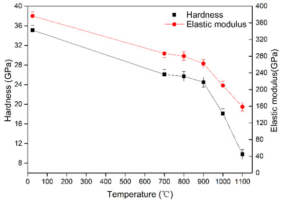 The hardness and elastic modulus of the (AlCrTiZrMo)N/ZrO2 nano-multilayered film with the ZrO2 layer thickness of 0.6 nm after annealing at different temperatures for 30 min are shown in Figure 7. In the annealing temperature range of 700–900 °C, the mechanical properties of the film decrease slightly. The hardness and elastic modulus of the (AlCrTiZrMo)N/ZrO2 film at 900 °C are 24.5 GPa and 262.3 GPa, respectively. The indistinctive drop in mechanical properties can be attributed to the fact that the nano-multilayered film is only slightly oxidized. The hardness and elastic modulus of the (AlCrTiZrMo)N/ZrO2 film decrease rapidly following annealing at 1000–1100 °C. The hardness and elastic modulus of the films annealed at 1100 °C decrease to 9.8 GPa and 158.6 GPa, respectively. After annealing at 1000 °C or 1100 °C, more oxides are produced during the annealing process, suggesting that the (AlCrTiZrMo)N/ZrO2 film is severely oxidized. As a result, the mechanical properties of the film degrade rapidly. It is worth noting that the mechanical properties of the (AlCrTiZrMo)N/ZrO2 film after annealing at 900 °C are nearly equivalent to those of the monolithic (AlCrTiZrMo)N film at room temperature, indicating that the (AlCrTiZrMo)N/ZrO2 film is stable at high temperatures and has a good high-temperature resistance.