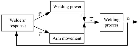Figure 2 is a block diagram of a system for online real-time adjustment of welding parameters by a skilled welder. It shows the welding process, the welding power supply, the arm movement of the welder, and the human welder (the welder’s response). The welding process described here is a manual GTAW welding process operated by the human welder; in addition, this block diagram can also be represented as an automatic welding process operated by the welder who only applies different means to adjust the welding parameters. Therefore, the welding process shown in Figure 2 is defined as a manual welding process.