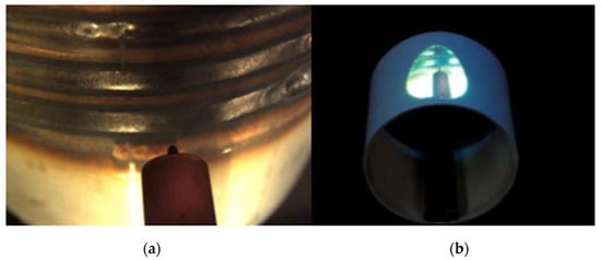 To ensure the authenticity of skilled welders in the virtual welding platform, the size of the selected workpiece model was the same as the size of the 304 stainless steel pipe. The molten pool images captured by the camera are projected on the workpiece model in real time and intuitively through the projector, and the position of the projector and the workpiece model is calibrated. The position of the molten pool images projected onto the workpiece model is synchronized with the real pipe, that is, the molten pool images fall just below the virtual welding torch. Figure 4a is a realistic picture of the welded workpiece as seen by the naked eye and Figure 4b is a virtual visual image projected onto the workpiece model through the projector. The welding torch is at the 12 o’clock position of the pipe, and the image projected onto the workpiece model is also at the 12 o’clock position, thus maximizing the restoration of the real welding state. The next section presents the results of welding tests at different current values completed by skilled welders using virtual reality welding.
