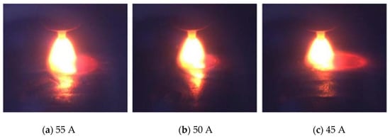 Figure 5 shows the projection of the molten pool on the workpiece model at different current values selected randomly, where Figure 5a–c shows the welding current values of 55, 50, and 45 A, as listed in Table 1. These group tests were used to obtain the empirical equation. As can be observed from the figure, the shape of the molten pool is obviously different with different welding currents and welding speeds. Therefore, the human welder can observe the virtual molten pool to determine the weld penetration and adjust their welding speed accordingly.
