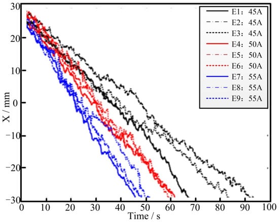 Tests with different welding current values were carried out in order to obtain skilled welders’ welding experience. Different speed curve results are shown in Figure 6; the welding current of test groups 1–3 was 45 A, that of test groups 4–6 was 50 A, and that of test groups 7–9 was 55 A. The Y-axis in Figure 6 shows the distance of the weld, the value of 0 mm is at the 12 o’clock position, and −30 and 30 are the distances to the 12 o’clock position. The workpiece material is generally known, so the heat input to ensure its penetration is certain. Therefore, the speed of the torch increases accordingly (it takes less time to weld the same length, about 45 to 50 s, as shown in Figure 6, with a large welding current value (55 A)). The welder completes the virtual welding test at a medium welding speed of about 60 s at a medium current value (50 A). Moreover, the welding speed is reduced accordingly with a low welding current value (45 A), in which case it takes about 70 to 90 s to complete the welding. The discrepancy in the tests of 45 A was much more evident. There are two reasons for the larger discrepancy. The first is the initial temperature, because all of the tests were conducted on the same pipe and the current of the first test group was 45 A. The second is the different penetration, because the welding speed is fast when the back of the welding line is small. In each group of tests, the time required to complete the welding varies with the same welding current value because the welder needs to ensure the weld penetration, which is determined by the molten pool during the welding process, and then adjusts the welding speed in real time.