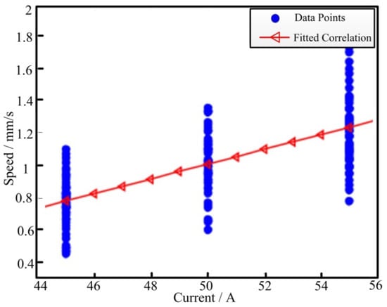 The obtained welding speed data were used in linear fitting to obtain a relationship model between the welding current and the welding speed, and the results are shown in Figure 7. The data shown in Figure 7 have a wide dispersion, but the speed value used for the linear regression was the average value of each welding current. The least square data fitting was used to obtain the linear model [23], as shown in Equation (3).