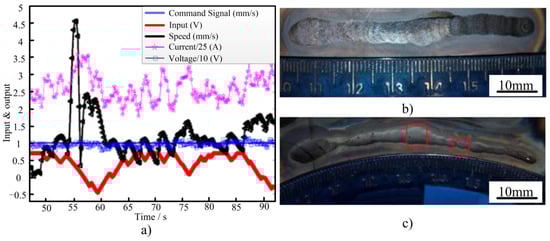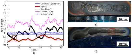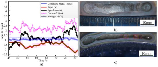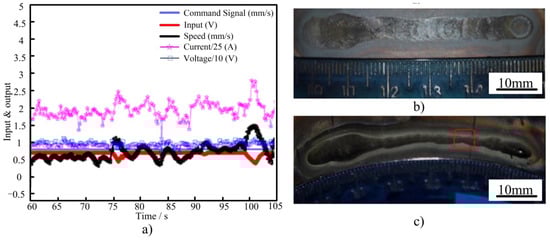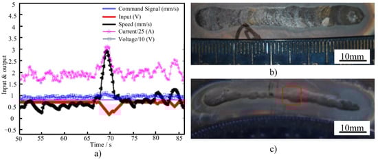 The first three groups of tests were conducted at a given welding speed of 0.8 mm/s. One group of data was extracted for analysis, and Figure 8a shows that the actual welding speed was well tracked, and the welding current linearly fluctuated with the welding speed, which was well controlled. At 60 s to 75 s, the welding speed is steadily controlled at 0.5 to 0.7 mm/s, which is lower than the given welding speed (0.8 mm/s). At this time, the control system outputs a voltage signal of +0.7 V and commands the welder to speed up, but the welder still maintained the original speed. This phenomenon may be due to the welder focusing on welding and ignoring the command signal. As the actual welding speed is low, if the initial welding current is set to weld, large heat input will result in defects such as the collapse of the molten pool. Therefore, the current compensation function of the designed intelligent controller will play its role, as can be seen in Figure 8a, in which the welding current is around 1.75. After the legend is enlarged by 25 times, the real current is about 44 A, which is lower than the given value (48 A). Therefore, the intelligent controller cooperates with the machine to reasonably match the welding current and ensure the stable heat input in the welding process. At 75 s, an acceleration process occurs and the welding speed is increased to 1 mm/s. At this point, the input voltage signal is reduced accordingly, commanding the welder to slow down, while the welding current is increased accordingly to ensure sufficient heat input in the molten pool. Subsequently, the welder gradually stabilizes, the welding speed fluctuates within a certain of 0.8 mm/s, and the welding current changes accordingly. As seen in the figure, the voltage value fluctuates slightly during the welding process. This is mainly because the welding current changes in real time due to the static characteristics of the welding power supply, resulting in a small change in the welding voltage (about 1 V); however, the impact on the welding shape can be ignored.
