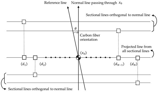 Here, and denote the complex conjugate and the absolute value of , respectively, and the maximum value of Equation (9) is 1 if i = j. If the number of measured locations is assumed to be , several parallel sectional lines can be presented orthogonal to the carbon fiber orientation, as illustrated in Figure 1. A single projected line that passes through the center of the UCBC structure () can be introduced among all sectional lines, and all measured points can be projected on the single line at a distance from the normal line. Both the normal and reference lines pass through the center () of the UCBC structure with an angle difference, .