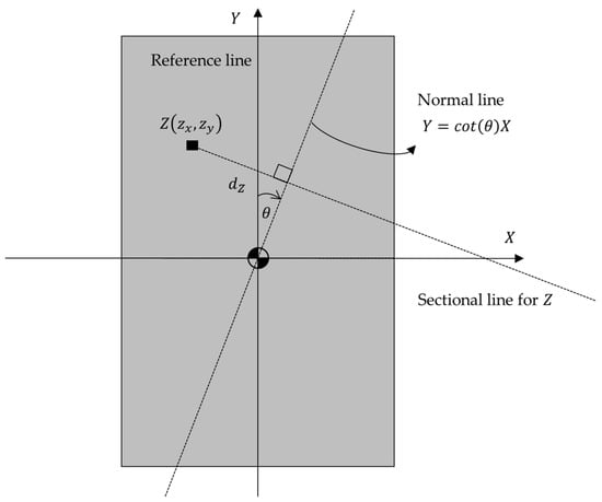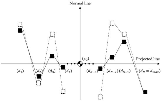 The distance of a certain measurement point from the normal line in Figure 1 can be explained by the graphical illustration in Figure 2. If one point is assumed to be located at (,) and the normal line is given as , distance can be formulated as Equation (10) [28]. In addition, the row matrix () of the distances of all measured points on the projected line in Figure 1 can be obtained as shown in Equation (11).