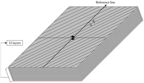 The dynamic characteristics of the UCBC structure were determined using an experimental model test with an impact hammer, and the target UCBC structure was a simple specimen, which was the same as that used in previous studies [25,26,27]. The configuration of the simple rectangular specimen was 80 mm (W) × 150 mm (L) × 3 mm (H) and made with a 12-layer, stacked, unidirectional, pre-implemented (UD prepreg) USN 250A (SK Chemical, Seongnam, Republic of Korea), as illustrated in Figure 4 [29]. A large 12-layered UCBC plate was manufactured using an autoclave curing process (125 °C maximum temperature) and cut into simple specimens with five orientations: , , , , .