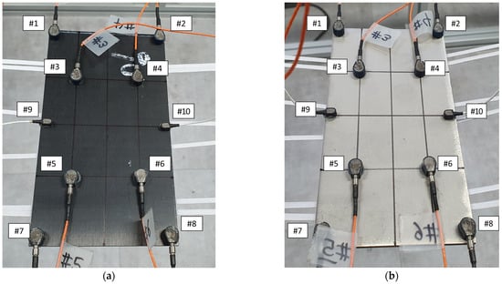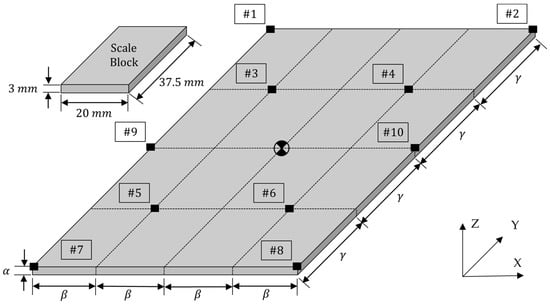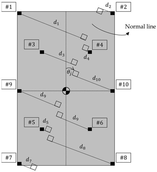 Ten locations of uniaxial (+Z direction) accelerometers were selected so as to distribute them by maximizing the observability of FRFs in UCBC structures, as shown in Figure 5. All attached uniaxial accelerometers (model: 3225F2, Dytran, Chatsworth, CA, USA) had very small weights (each accelerometer: 1 g) compared to that of the UCBC specimen (56.5 g), such that the mass loading from the accelerometer could be neglected. The distance of ten measurement points (#1–#10) from the normal line is illustrated in Figure 6 for carbon fiber orientation .