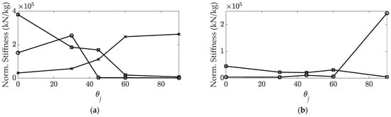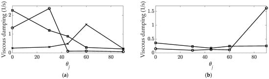 Figure 8 and Figure 9 show the variations in the structural stiffness and viscous damping coefficient with the increase in carbon fiber orientation, respectively, and both variation trends showed different results as compared to those from previous studies [25,26,27]. The simple but direct analysis will be to check it again with other two other multiple indicators, variations in the resonance frequency and viscous damping coefficient, as was performed in the reference [27]. The other approach is focused on updating the proposed mode shape by applying for a different modification window rather than the current one, which is just proportional to the distance between the measurement location and the normal line. The optimal curvature or line of the modification window may enhance the MAC values of UCBC structure as future research.