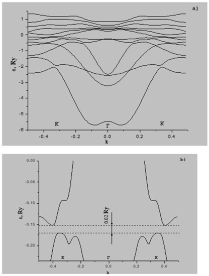 To calculate the electron spectrum of graphene with adsorbed potassium atoms, we chose the wave functions of the 2s and 2p states of neutral non-interacting carbon atoms asthebasis. In the calculation of matrix elements of the Hamiltonian, we took three first coordination circles. The energy spectrum for graphene was computed employing the temperature T = 0 K. In our computations, we disrespect the re-normalisation of vertices of the mass operator of the electron–electron interplay. We consider the limiting case of an ordered arrangement of potassium atoms on the surface of graphene. The dependence of the electron energy on the wave vector is calculated, in this case, on the basis of the Equation (89) obtained in the work for the poles of Green’s function.
